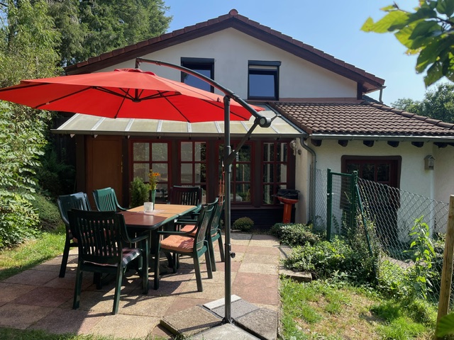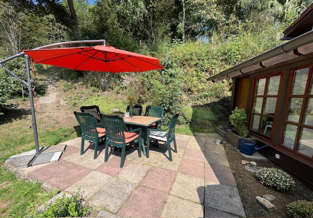 Gartengarnitur, Holzkohlegrill, Sonnenschirm, Wasserstelle zum reinigen der Hunde.